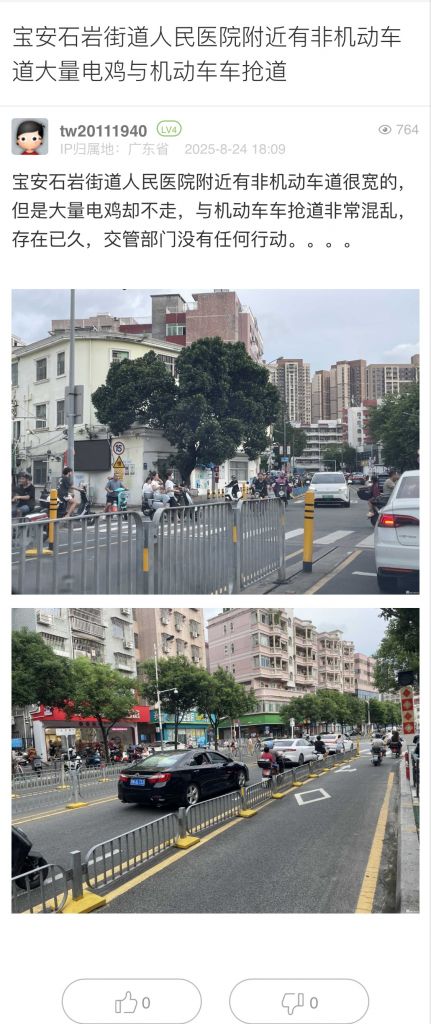 38. 帖文《寶安石巖街道人民醫(yī)院附近有非機(jī)動(dòng)車(chē)道大量電雞與機(jī)動(dòng)車(chē)車(chē)搶道》