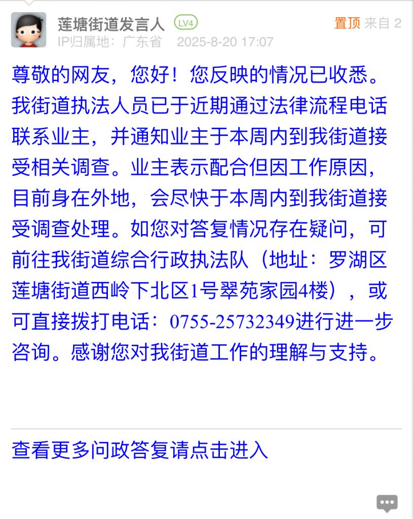 尊敬的網(wǎng)友,您好!您反映的情況已收悉。我街道執(zhí)法人員已于近期通過(guò)法律流程電話(huà)聯(lián)系業(yè)主,并通知業(yè)主于本周內(nèi)到我街道接受相關(guān)調(diào)查。業(yè)主表示配合但因工作原因,目前身在外地,會(huì)盡快于本周內(nèi)到我街道接受調(diào)查處理。如您對(duì)答復(fù)情況存在疑問(wèn),可前往我街道綜合行政執(zhí)法隊(duì)(地址:羅湖區(qū)蓮塘街道西嶺下北區(qū)1號(hào)翠苑家園4樓),或可直接撥打電話(huà):0755-25732349進(jìn)行進(jìn)一步咨詢(xún)。感謝您對(duì)我街道工作的理解與支持。