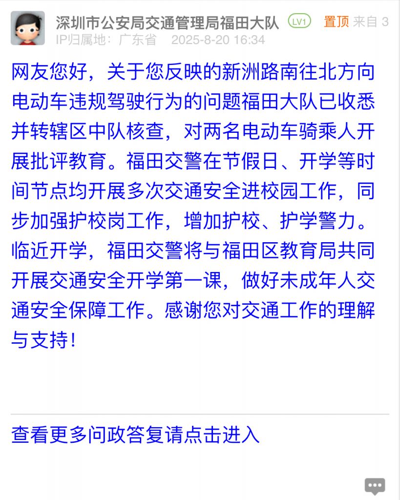 網(wǎng)友您好,關(guān)于您反映的新洲路南往北方向電動(dòng)車(chē)違規(guī)駕駛行為的問(wèn)題福田大隊(duì)已收悉并轉(zhuǎn)轄區(qū)中隊(duì)核查,對(duì)兩名電動(dòng)車(chē)騎乘人開(kāi)展批評(píng)教育。福田交警在節(jié)假日、開(kāi)學(xué)等時(shí)間節(jié)點(diǎn)均開(kāi)展多次交通安全進(jìn)校園工作,同步加強(qiáng)護(hù)校崗工作,增加護(hù)校、護(hù)學(xué)警力。臨近開(kāi)學(xué),福田交警將與福田區(qū)教育局共同開(kāi)展交通安全開(kāi)學(xué)第一課,做好未成年人交通安全保障工作。感謝您對(duì)交通工作的理解與支持!