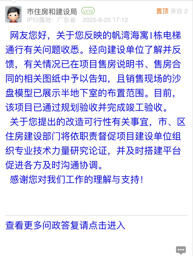 網(wǎng)友您好,關(guān)于您反映的帆灣海寓1棟電梯通行有關(guān)問(wèn)題收悉。經(jīng)向建設(shè)單位了解并反饋,有關(guān)情況已在項(xiàng)目售房說(shuō)明書(shū)、售房合同的相關(guān)圖紙中予以告知,且銷(xiāo)售現(xiàn)場(chǎng)的沙盤(pán)模型已展示半地下室的布置范圍。目前,該項(xiàng)目已通過(guò)規(guī)劃驗(yàn)收并完成竣工驗(yàn)收。
