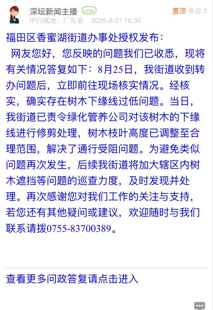網(wǎng)友您好,您反映的問(wèn)題我們已收悉,現(xiàn)將有關(guān)情況答復(fù)如下:8月25日,我街道收到轉(zhuǎn)辦問(wèn)題后,立即前往現(xiàn)場(chǎng)核實(shí)情況。經(jīng)核實(shí),確實(shí)存在樹(shù)木下緣線(xiàn)過(guò)低問(wèn)題。當(dāng)日,我街道已責(zé)令綠化管養(yǎng)公司對(duì)該樹(shù)木的下緣線(xiàn)進(jìn)行修剪處理,樹(shù)木枝葉高度已調(diào)整至合理范圍,解決了通行受阻問(wèn)題。為避免類(lèi)似問(wèn)題再次發(fā)生,后續(xù)我街道將加大轄區(qū)內(nèi)樹(shù)木遮擋等問(wèn)題的巡查力度,及時(shí)發(fā)現(xiàn)并處理。再次感謝您對(duì)我們工作的關(guān)注與支持,若您還有其他疑問(wèn)或建議,歡迎隨時(shí)與我們聯(lián)系請(qǐng)撥0755-83700389。