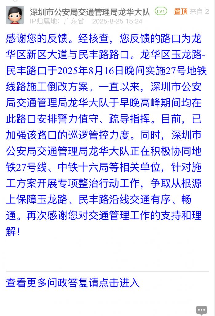 感謝您的反饋。經(jīng)核查,您反饋的路口為龍華區(qū)新區(qū)大道與民豐路路口。龍華區(qū)玉龍路-民豐路口于2025年8月16日晚間實(shí)施27號(hào)地鐵線(xiàn)路施工倒改方案。一直以來(lái),深圳市公安局交通管理局龍華大隊(duì)于早晚高峰期間均在此路口安排警力值守、疏導(dǎo)指揮。目前,已加強(qiáng)該路口的巡邏管控力度。同時(shí),深圳市公安局交通管理局龍華大隊(duì)正在積極協(xié)同地鐵27號(hào)線(xiàn)、中鐵十六局等相關(guān)單位,針對(duì)施工方案開(kāi)展專(zhuān)項(xiàng)整治行動(dòng)工作,爭(zhēng)取從根源上保障玉龍路、民豐路沿線(xiàn)交通有序、暢通。再次感謝您對(duì)交通管理工作的支持和理解!