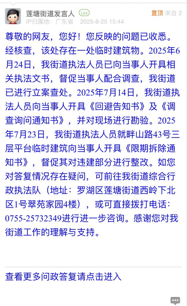 尊敬的網(wǎng)友,您好!您反映的問(wèn)題已收悉。經(jīng)核查,該處存在一處臨時(shí)建筑物。2025年6月24日,我街道執(zhí)法人員已向當(dāng)事人開(kāi)具相關(guān)執(zhí)法文書(shū),督促當(dāng)事人配合調(diào)查,我街道已進(jìn)行立案查處。2025年7月14日,我街道執(zhí)法人員向當(dāng)事人開(kāi)具《回避告知書(shū)》及《調(diào)查詢(xún)問(wèn)通知書(shū)》,并對(duì)現(xiàn)場(chǎng)進(jìn)行勘驗(yàn)。2025年7月23日,我街道執(zhí)法人員就畔山路43號(hào)三層平臺(tái)臨時(shí)建筑向當(dāng)事人開(kāi)具《限期拆除通知書(shū)》,督促其對(duì)違建部分進(jìn)行整改。如您對(duì)答復(fù)情況存在疑問(wèn),可前往我街道綜合行政執(zhí)法隊(duì)(地址:羅湖區(qū)蓮塘街道西嶺下北區(qū)1號(hào)翠苑家園4樓),或可直接撥打電話(huà):0755-25732349進(jìn)行進(jìn)一步咨詢(xún)。感謝您對(duì)我街道工作的理解與支持。
